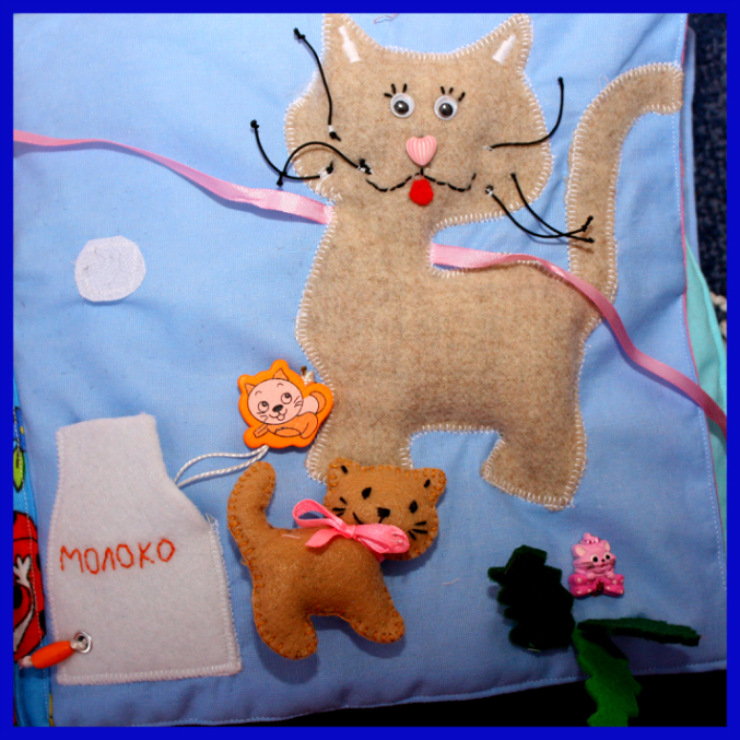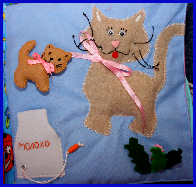2 сраничка.Кошки.У мамы кошки можно развязать бантик и подергать за усики.Котенок отстегивается(он на липучке).