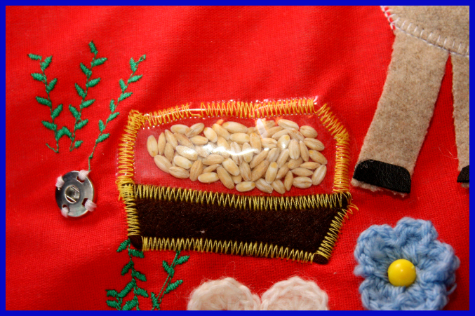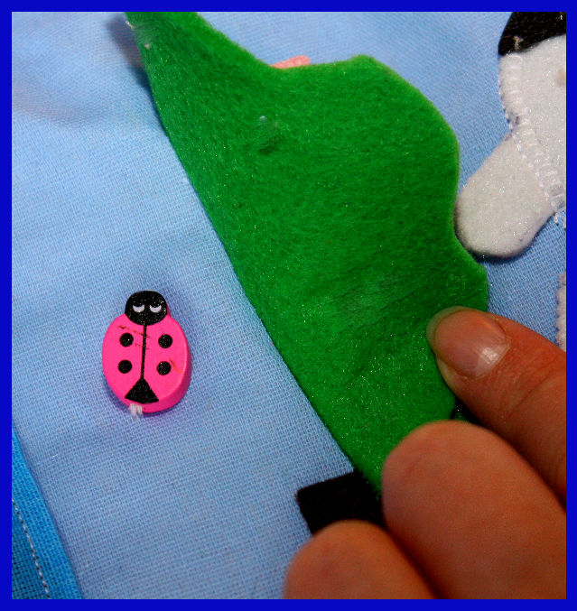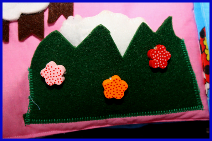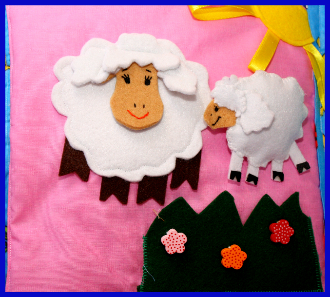 3 страничка .Овечки.Младшая на кнопке-может гулять возле мамы,а может спрятаться в траве(карман) с цветками.Цветы можно трогать,солнышко с лучиками-ленточками-можно трогать