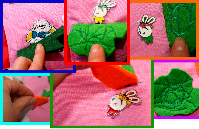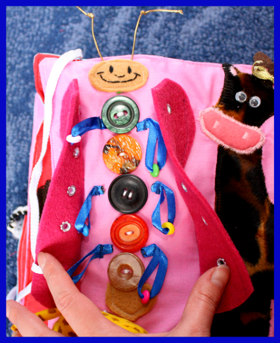 Лапки гусенички можно теребить,как и само туловище-пуговки,а еще можно считать...Усики у бабочки можно подергать-это резиночки