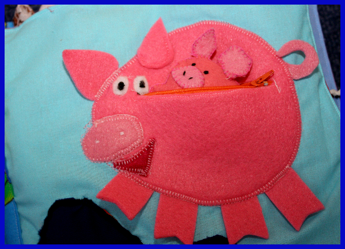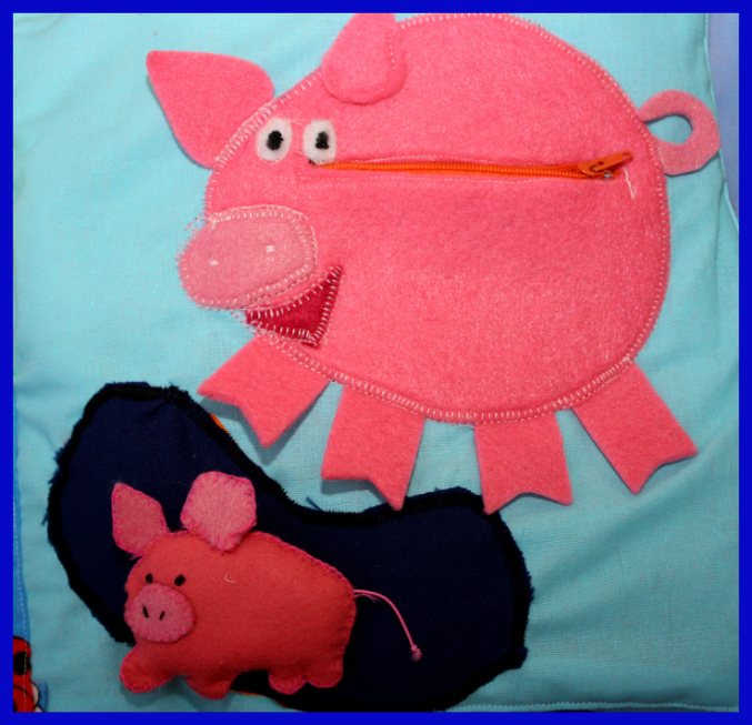 4 страничка Свинка с поросенком.Поросенок может лежать в луже(лужа шуршит),а может сидеть у мамы в кармане.Хвостик поросенка можно потянуть