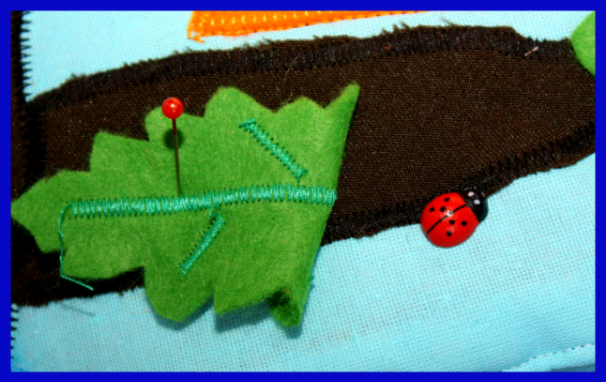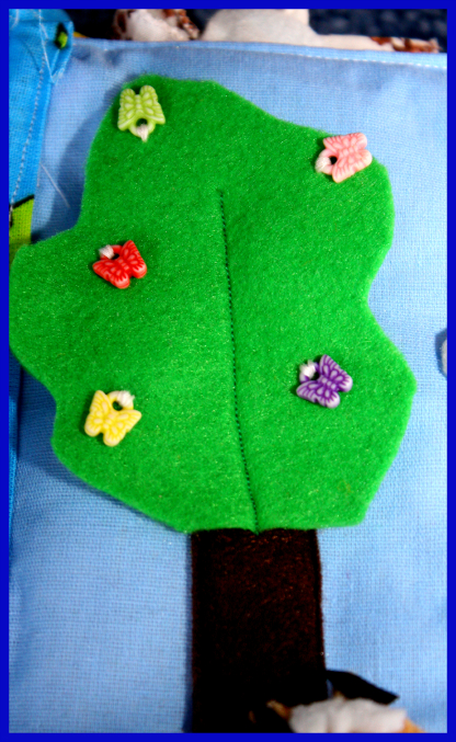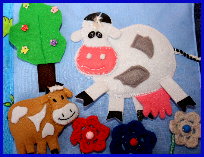 6 страничка.Корвки.Теленок отстегивается(он на кнопке),цветочки вязаные,на дереве сидят бабочки(можно считать).Рожки и копыта кожаные.