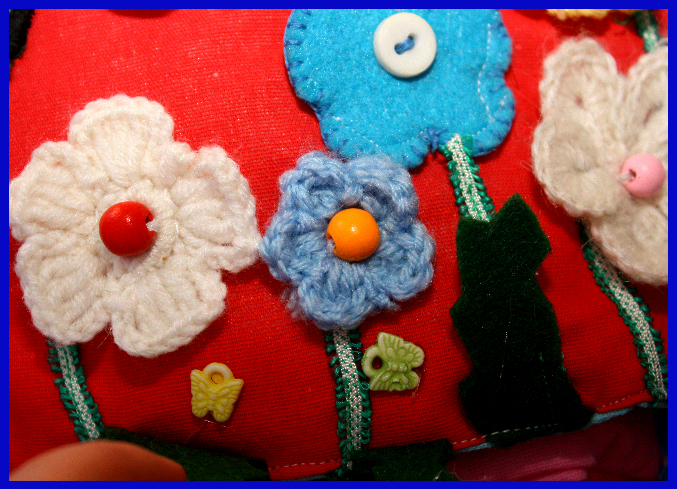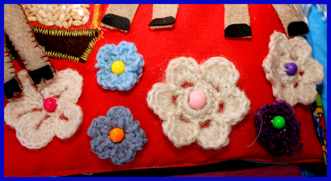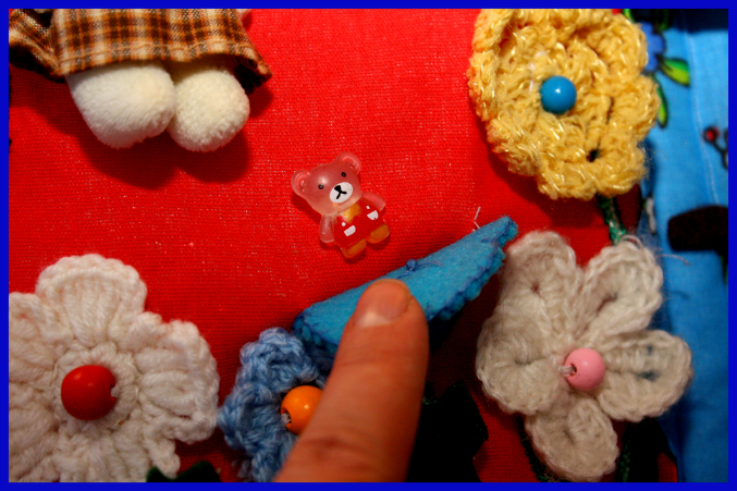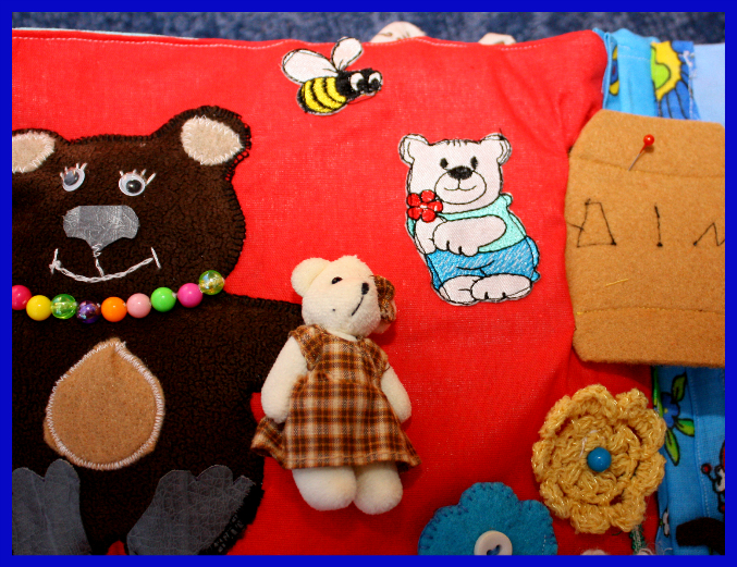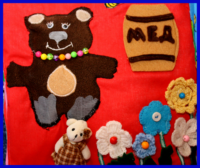 9 страничка.Медведи.У мамы -медведицы можно потрогать бусы.Медвежонок отстегивается(она на кнопке и вообще это бывший брелок)Цветочки вязаные
