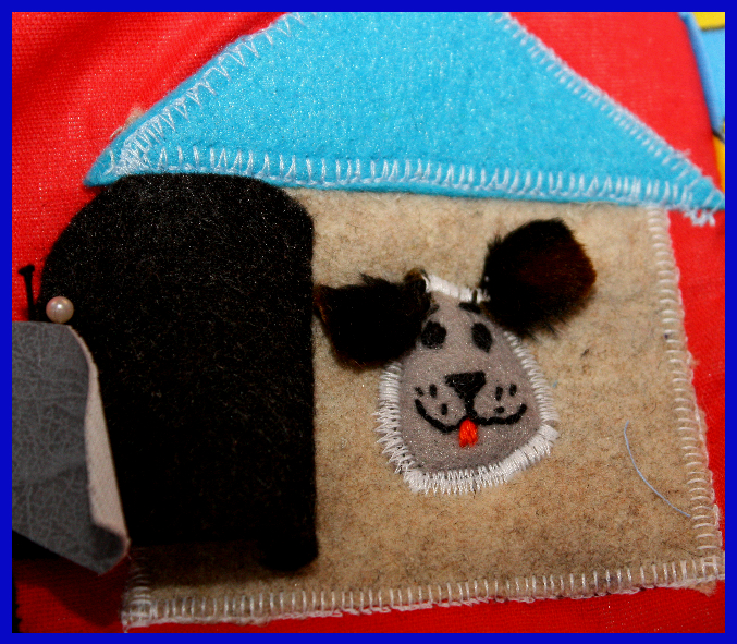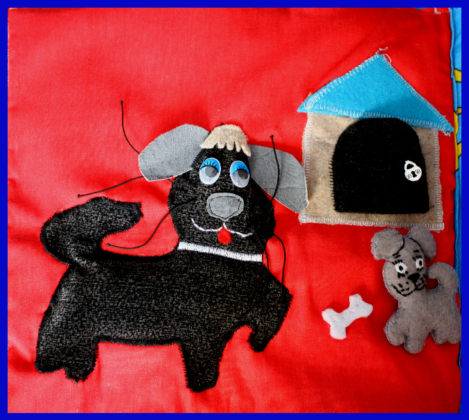1 страничка. Собаки.Маму собаку можно потрогать за ушки и носик(они кожанные)пожергать за усики(шляпная резинка)В будке сидит щенок,второй щенок на кнопке-им можно играть отдельно