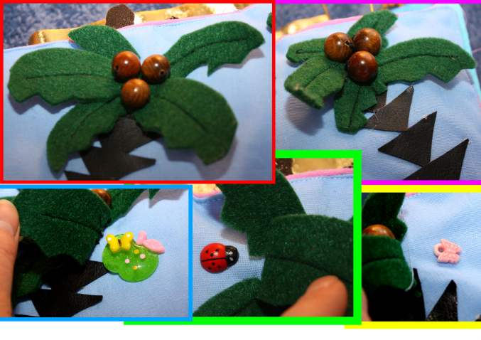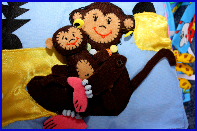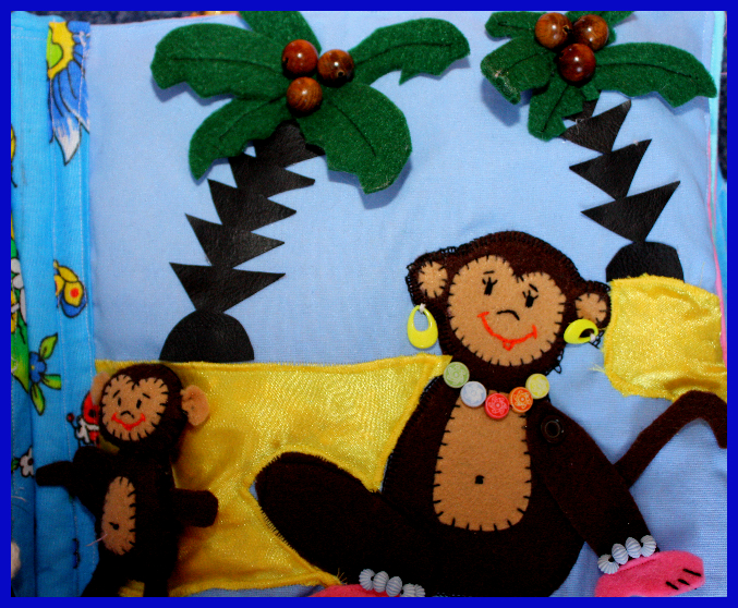 10 страничка Обезьянки.Мама-обезьянка может сидеть и опираться на руку,а может рукой держать малыша(там липучка)У мамы можно потрогать сережки,бусы и браслеты.МалышМожет лежать на песочке(песок можно трогать,там перловка),а может обниматься с мамой