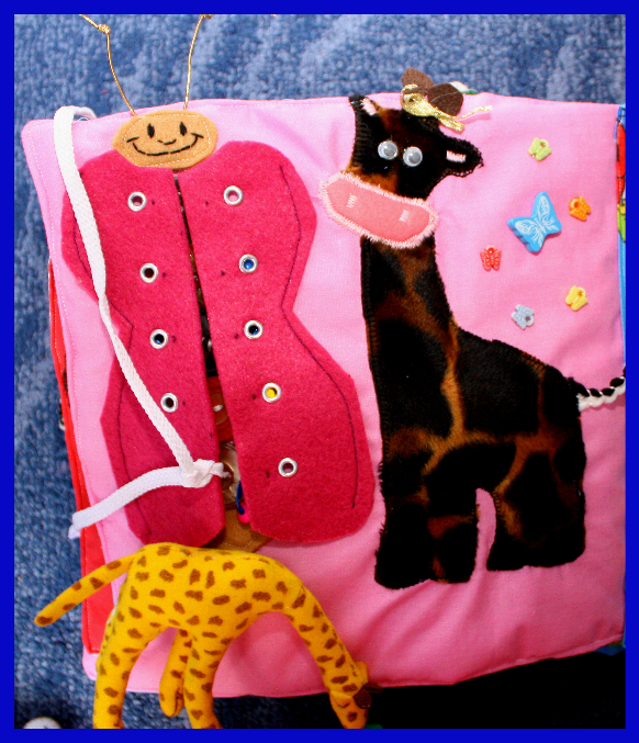 11 страничка Жирафы и бабочки.Жираф-детка(покупной) на кнопке.Бабочка-шнуровка(очень хотелось куда то всунуть шнуровку),под крылышками гусеница,которая потом превращается в бабочку,ну и еще много всяких бабочек