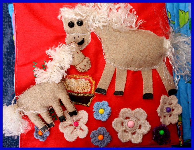 5 страничка.Лошадки.Жеребенок отстегивается(он на кнопке)Гривы и хвосты пушистые,Копытца кожаные,цветочки вязанные,можно щупать