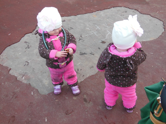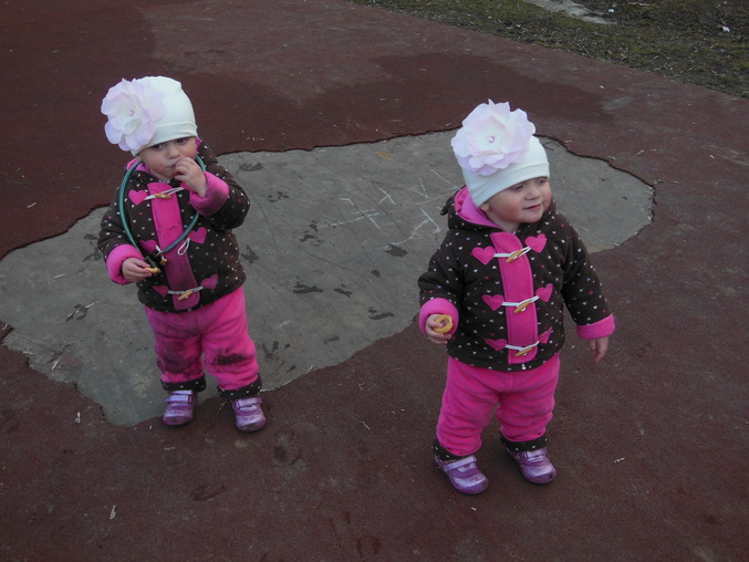Девульки прелесть:-)И шапочки знакомые и костюмчик с ушками:-)А коленки,ух,просто супер:-)Грязнулька.А в горошек,ну просто гномики маленькие:-)