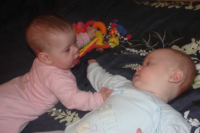 О подвигах и достижениях))) Берут игрушки, все в рот))) Трясут погремушками, жуют их, иногда бьют друг друга ими,а бывает и отнимают, но неосознанно пока. Соску могут засунуть или высунуть,отобрать у брата/сестры. Болтают громко, дочка визжит. Пытаются садиться, напрягают пресс, из положения лежа за руки в легкую садятся, опираются на руки. Силу в руках и даже ногах почувствовали. Доча так вообще та еще юла. Вертится вокруг своей оси, пытается ползти, вставать на мне, садиться, переворачивается, делает лодочку. Ей на месте не сидится. А сынуля конечно поленивее немного. Тоже самое делает,но редко или без охоты. Переворачивается тока, когда меня нет рядом. Так обидно))) Но сидеть его мечта прям. Заливистый хохутун,особенно когда папка рядом. Ритузина смеется скромно или беззвучно, как я это называю. Постоянно улыбается. Любительница царапать ноготками по ткани или по родне)) Маникюр уже устала ей обрезать))