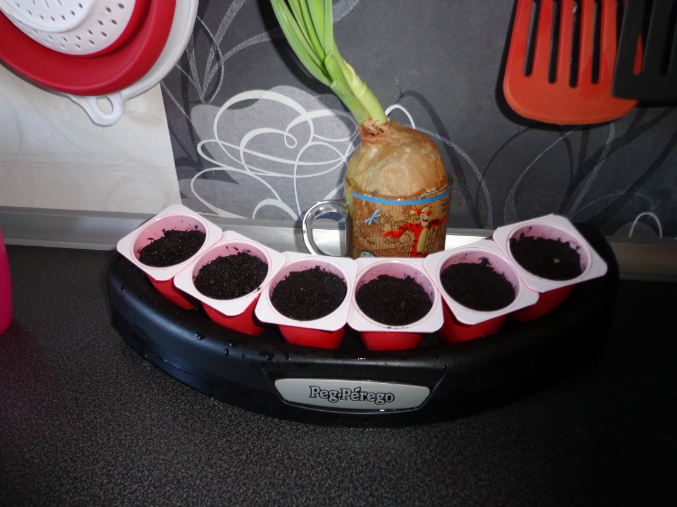 И вот мы решили посадить :)))) Я еще лучок у себя нашла, который пророс. И устроили мы грядки :))))