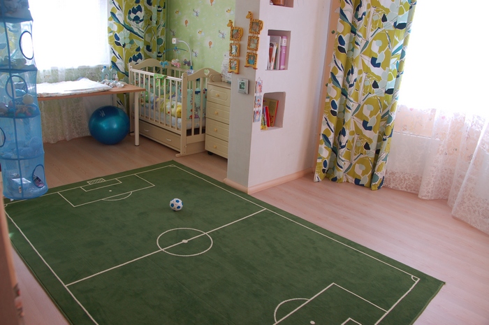 Здесь надо отметить, что в этой конструкции дома в комнате есть две несносимые вертикальные балки, которые априори делят ее пополам. Мы удлинили гипсокартоном одну балку и там появились домики для книжек. Пока детки не ползали, так у нас и было - половина под спальню, а в другой половине стояла моя кровать. Когда детки начали немного ползать, я пересмотрела свои взгляды на деление комнаты, мне захотелось игровую зону сделать как можно больше. Кстати, именно после выпуска их на такие просторы они стали активно ползать и вставать. Вот что у нас получилось: