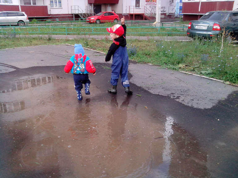 Всё,тушите свет(((Дети даже в садике не гуляют((А позавчера вроде потеплело,даже солнышко выглянуло,мы плюнули,одели детям резиновые сапожки,Савику еще и штаны непромокайки и пошли бегать по лужам!!Так классно было!Жаль,что у нас с мужем нет резиновых сапог))Вокруг дома все лужи померили,но возле детской площадки луже поглубже были,там и остались.Какой у детей был восторг,девочки!Столько визгу было))Мамаши с площадки так смотрели на нас)))))А бабуськи у подъезда(что странно) восхищались нами,типа вот молодцы,ребята,настоящее детство у детей)))))Ну вот были бы у двойнят непромокайки,погуляли бы дольше,но Лиза подскользнулась и прям увалилась в грязнючую лужу и ржет)))Потом следом за ней и Тимон уселся в лужу))Мокрые насквозь,мы пошли оооочень довольные домой в теплую ванну с пенкой!!Дети вырубились за минуты!!Вывод-как можно больше веселья в любую погоду,дать детям воли и купить непромокайки!!)))))Ну вот и фоточки!Только опять с телефона,т.к. фотик мы наш так и не отремонтировали(((