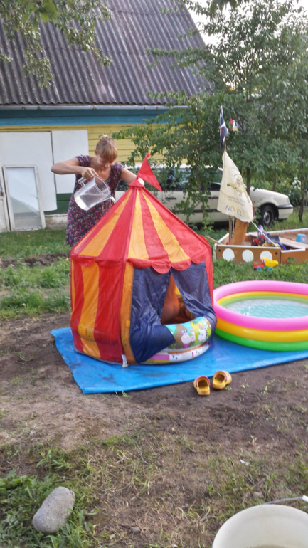 Есть у нас икеевский домик,в него засунула бассейн,наливаю воду,добавляю горячую и вуаля......баня готова.А она у нас еще и с душем))))Малые в восторге и помылись и покупались.Я сама туда залазила,супер.Эти синтетические палатки воздух не пропускают,ветер тоже и там реально тепленько,а вечера у нас уже не жаркие.Малые купаются ,а потом я их быстро в полотенце заворачиваю и в дом.Ну и конечно фото.Может кому то моя идея пригодится.