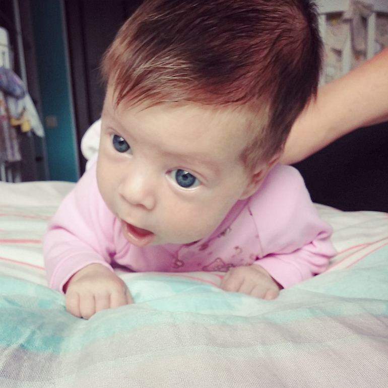 В целом все неплохо, Лера очень любопытная, следит за всеми, кто-куда пошел, кто-что говорит, ее легко занять погремушкой, музыкой, песенками, стихами и т.д, а иногда она и сама может часок лежать спокойно и играть сама с собой, ее легче уложить спать. немножко гулит, много улыбается, беззвучно смеется, но совсем не хочет поднимать голову лежа на животике, а Ева у нас девушка серьезная, пока не такая контактная, особо не смотрит за нами, хотя в последние дни уже делает это лучше, раньше ей совсем ничего не было интересно, ей нравится лежать в шезлонге, играть с тряпочкой, меньше улыбается и смеется, больше плачет без видимого повода, но зато хорошенько старается поднимать головку)