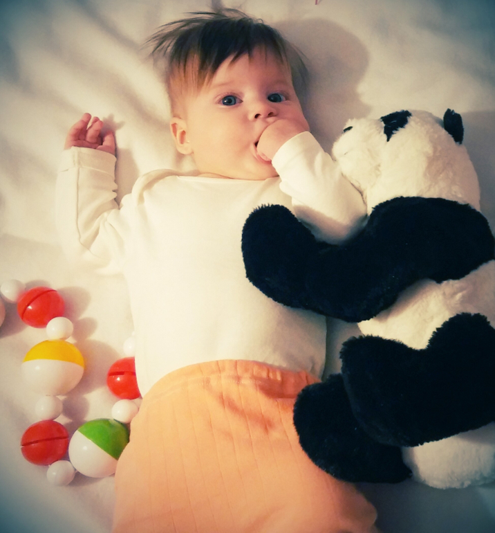 Лера по-прежнему такая же обаяшка, улыбается как только с ней заговоришь или начнешь играть, все также требует еду и внимание, сама себя ну никак не хочет развлекать, ленивая просто жуть, не хочет сама держать соску, бутылочку и т.д., во время игр пассивна в движениях, все эмоции на лице. Вертится со спины на живот, с живота на спину по вдохновению) Когда со спины на живот переворачивается, то частенько руки застревают под животом, злится) Ноги в рот тянет, сантиметра 3 осталось дотянуть) Улыбается, хохочет, любит болтать с рукой, соской, чем-нибудь во рту))