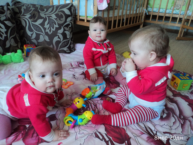 Четверня в упряжке: мама и тройняшки :)Это я про то что наша средненькая из тройняшек Машенька СЕЛА!!!!Без опоры на ручки ,они заняты теперь игрухами. Теперь она догнала нашу младшенькую Танюшку.Танюшка села ровно в 7 месяцев, а Маша через 2 недели в 8.5 мес.Теперь будем ждать Анютку)))Странно что Таня сначала села а потом встала в кроватке,а Маша наоборот)))Анюта тоже уже стоит,ждем посиделок))