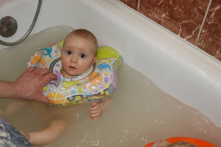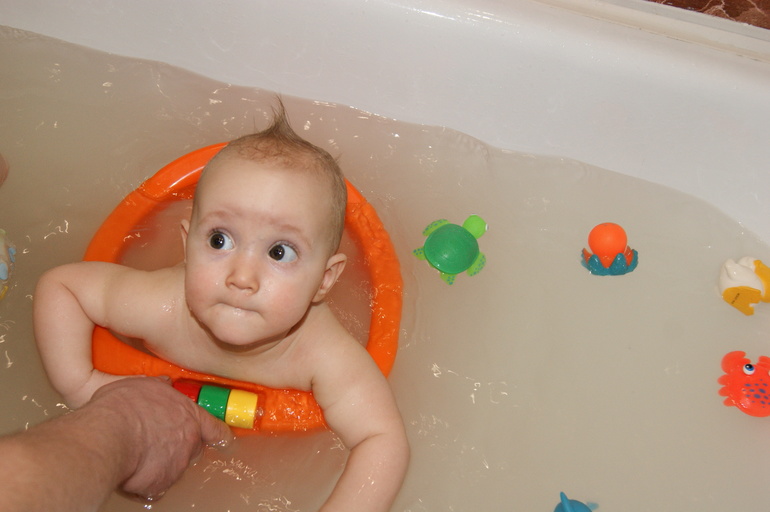 О, это он сидит в стульчике для купания. Но у нас они неудачные или ванна не удачная. С рифленым дном, присоски не присасываются.