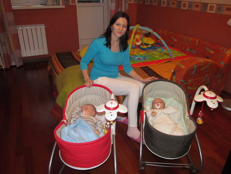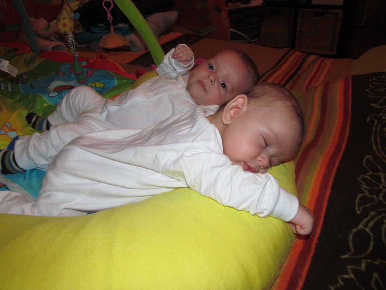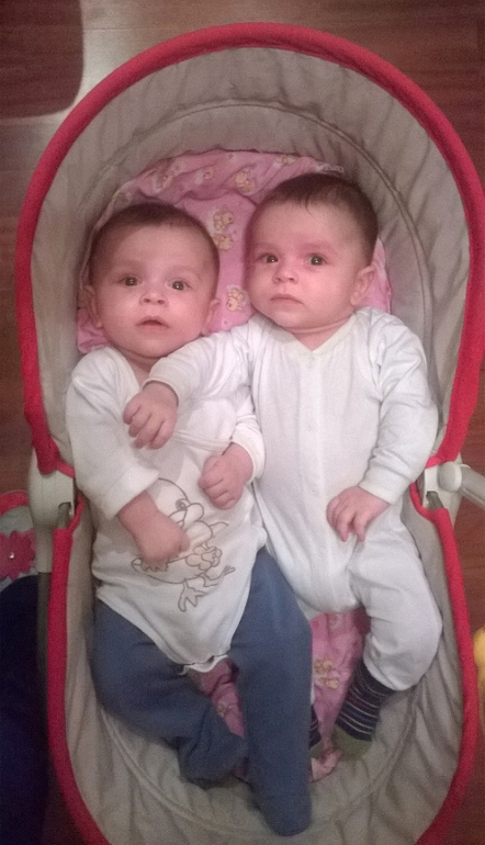 Ромка ма-ма-ма уже выговаривает во время плача, вообще очень контактные малыши. Что поразило врачей в роддоме еще, так это их любопытство. На вторые сутки мне их принесли и охали-ахали все, даже медсестры сбежались, мои малыши начали внимательно будто сканировать сначала меня, именно оглядывали сверху-вниз, вдоль-поперек, рассматривали лицо и его подробности, я была ошарашена, и врачи тоже. При этом их лица были серьезные, сосредоточенные. Потом взяла их врач, они и ее так же просканировали. Врач даже позвонила своему мужу и поделилась этим. Дома это продолжилось. Ромку муж прозвал "смотрящий", тк он его дольше изучал. А Герман запомнил сразу и уже не напрягался. Вообще проблем глобальных с ними нет, я ожидала худшего, но не так страшен черт. Особенно неохота было укачивать на ночь, а потом как-то так само за первый месяц повелось, что я кладу их в люльки в 21-30 и даю бутылки (сама не держу, я делаю типа подставки из пеленки), выключаю свет и выхожу в кухню. Они сами засыпают и просыпаются кушать в 5- 5:30 утра потом. Интервал ок 4 часа. И так уже 3 месяца. Очень удобно, тк хочется иметь и личное время пару часов после их укладывания. Ну а теперь фоты: