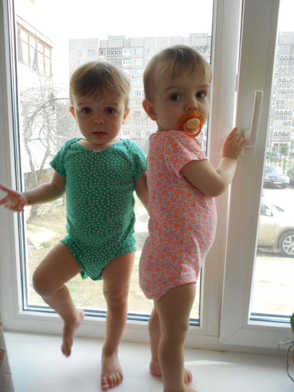 Двойняшки от 1 года до 3-хНедавно нам исполнился 1г и 4 мес.Большииие)))Лерочка 12кг и 85 см. роста,Кристинка 10.8кг и 84см.Девчонки очень повзрослели и очень многому научились!К умению разбрасывать вещи и игрушки из ящиков,добавилось умение вскрывать фиксаторы на дверях,так что "Здравствуй помойка и кастрюльки!".Еще мы умеем почти без рук залезать на подоконник)Пипец товарищи!Теперь мой день-это круговорот детей в квартире))) Пока снимаю одну с окна,вторая на кухне уже в помойке роется