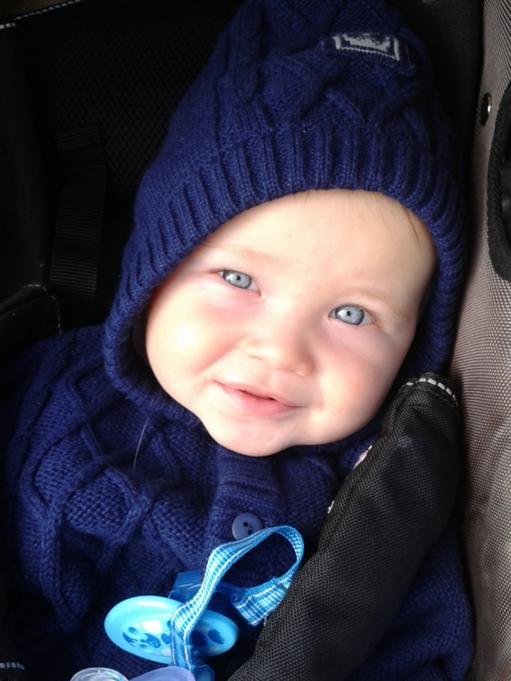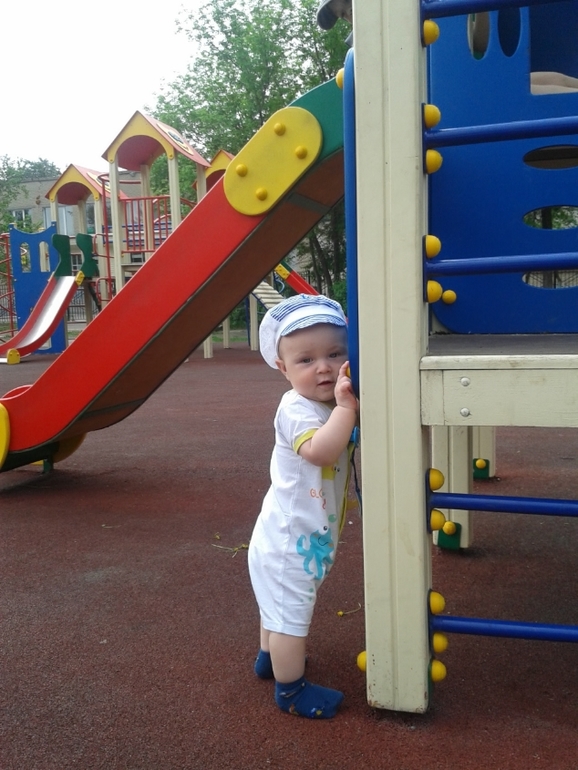 Санек у меня ползает, встает, ходит вдоль диванов, ходит толкая табуретку. Уже несколько дней ходит за одну руччку, но еще ооочень неуверенно. Лезут зубки))) Пока всего 3 (вылезли 10 и 22 апреля нижние и 10 мая верхний), еще на подходе 3 сверху. По ночам какой-то АТАС!!! Мы ползаем во сне, кувыркаемся с одного бока на другой, бодаем кроватку, в итоге просыпаемся и орем! И так может продолжаться ввсю ночь. Но иногда спит спокойно полночи. Голос у нас как у настоящего мужика, дедушка сказал, что надо отдавать в церковный хор))) Весит он наверное около 11 кг. Рост не мерили, но он уже под стол не влезает. Думаю, что около 80 см. Ему надо идти. ползти, все хватать и он очень большой любитель соски)))