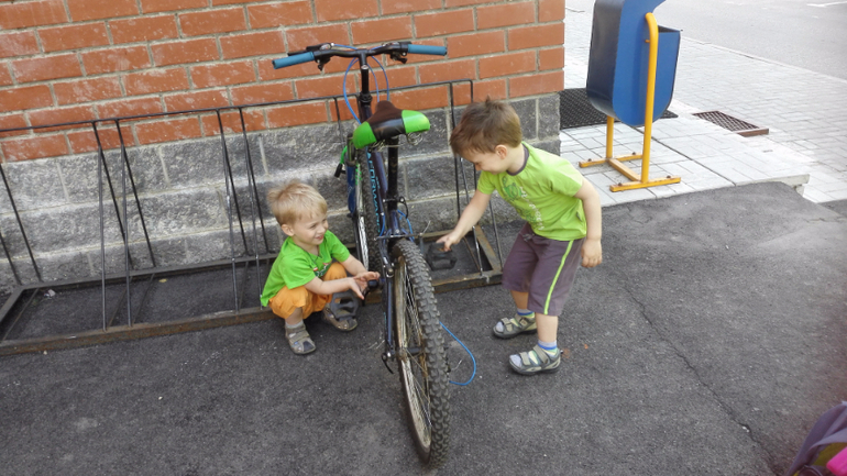 Наконец-то проявили интерес к транспорту. Понемногу осваиваем самокаты и беговелы,но интереснее всего оказался велосипед...тежеленный,не очень удобный,кем-то отданный нам:
