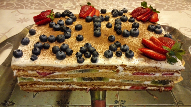 Медовый с фруктами и ягодами:)Скушали без остатка:))