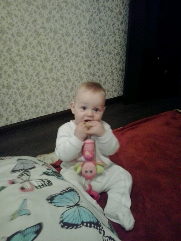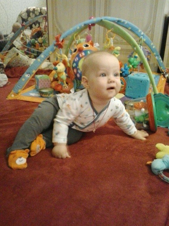 Сел, пополз как положено на четвереньках и встает у опоры. И ходим за руки (не злоупотреблям). Совершил первый полет с кровати нашей, море его и маминых слез, как итог разбитая губа (без рассечения, от удара вздулась до носа), печально, каюсь не усмотрела, тогда в начале месяца он не ползал еще как ужаленный и я отвернулась не больше чем на секунду, а он преодолел кровать до края и шлепнулся на линолеум шершавый вниз головой(((но за 2 все зажило, теперь кровати для нас табу. Только пол. Там и проводим все наше время. Человечек настроения- может сидеть играть себе в игрушки, грызть че нибудь, ковырять, при этом сосредоточенно сложив губы в трубочку, а надоест будет ползти либо искать интересности какие нибудь в виде проводов, 3литровой банки с огурцами на кухне на полу или красные тапочки в коридоре (все это отбирается поэтому всегда к ним стремимся), либо ползет ко мне и бесцеремонно карабкается на меня, и залазит ведь, молодец такой. Волосы правда дергает, и кусается своими острыми зубами приятного мало) Сестренку любит трогать, дергать за пушок на голове, за моську хватать, облизывать, а она орет, хотя нередко сама к нему лезет))смешные)) Тиму я зову мамсик, титю любит до безумия, всю ночь сосет и с мамой спит под утро)