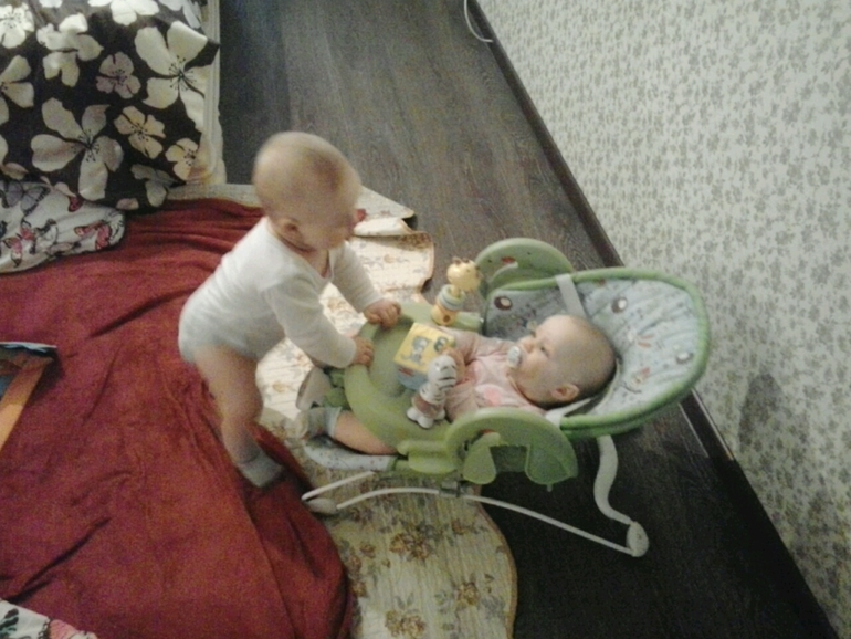 смотрят друг на друга ребятки, перекрикиваются, смеются))) по утрам из кроваток так смешно друг на друга пялятся - он стоит (ему то дно давно опустили ), а она на четвереньках башку тянет выглядывает)))