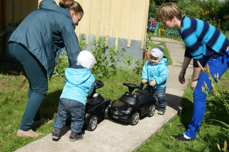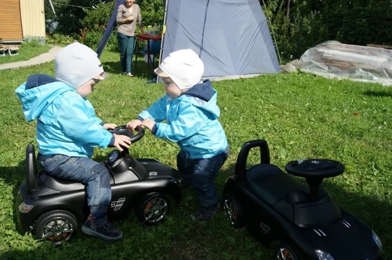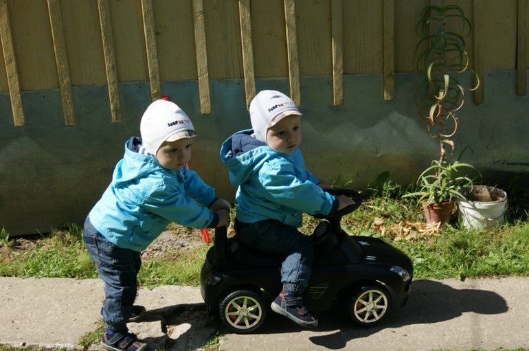 Много писать не буду. Ну что писать: весим больше 10 кг. рост к 80 приближается. Бегаем, шишки набиваем. Лезем везде, падаем, ух жалко ребятишек моих милых! Стали сообразительными, хитрыми. Двери открытые закрывают, закрытые требуют открыть. Друг с другом немного играют, в основном шкодят вместе...