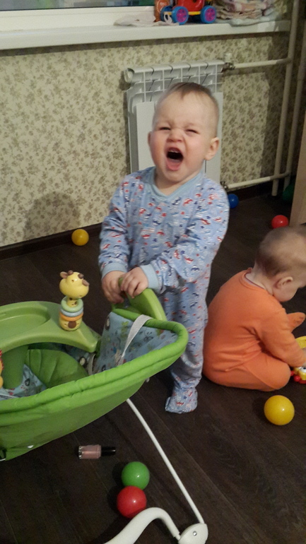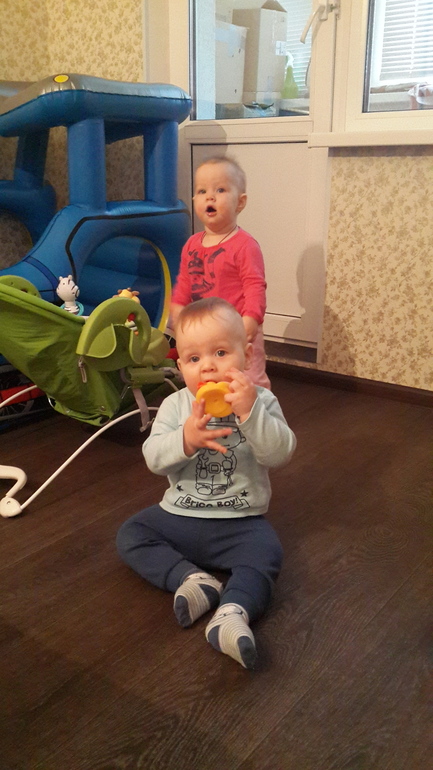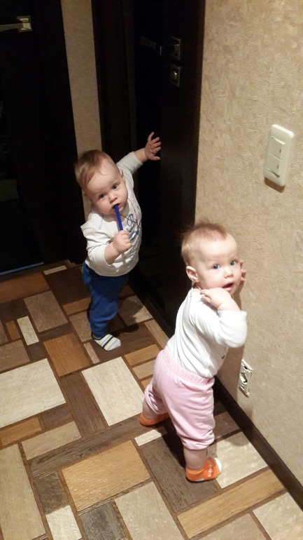 Двойняшки до 1 годаДа! да! Мы пошли! почти в 10 месяцев. Сначала Диана неуверенно протопала от мамы к папе а на следующий день и Тимур! И вот почти 2 недели мы учимся уже ходить. У Диашки это получается хорошо и проворно! сначала делала по несколько шажков от опоры к опоре, постепенно увеличивала расстояния, и теперь может протопать весь коридор и спальню, может сама останавливаться и опускаться на пол. И видно, что нравится ей учиться и как только хорошо получается - улыбается и смотрит на меня, ждет похвалы) У Тимоши похуже получается, ему бы все быстрее и быстрее надо, не признает он постепенности, надо все и сразу, поэтому шаги у него зачастую бегом) Но все равно прогресс с каждым днем все виднее, некоторые расстояния проходит, иногда даже опускается сам а не падает. Ходит как медведь - из стороны в сторону качается)) Падают конечно много оба, много синяков, но в основном падения безболезненны - встали и дальше пошли)