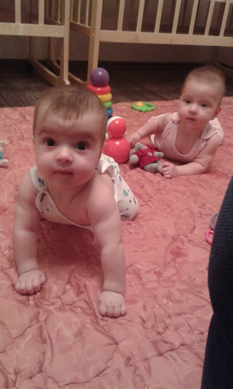 Глобально с 5 мес. не изменилось ничего. Малышки выросли, окрепли, особенно после массажа. Стали переворачиваться в 5.5. Но как-то в одну сторону и хоть ты тресни!(( Марго крутится и на живот и на спину, а Влада только на живот. Обратно не умеет по сей день. Не уверена, что это нормально. Стоят обе на четвереньках и раскачиваются или прыгают, как лягушата))). Зубов нет, но периодически истерим. Надеюсь, что из-за зубов.