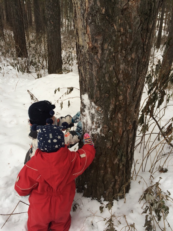 Погуляли по лесу и сугробам. Дошли до речки посмотрели как бежит вода. Полепили снег на деревья. Просто покидали лопатками и поделали куличики.