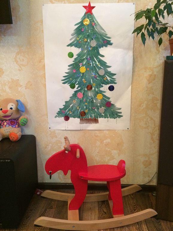 в пятницу мы сделали замечательный плакат с елочкой и повесили на стене. Я нарисовала, дети украшали наклейками. Добавили блеска с помощью геля-карандаша, сделали звезду и добавали шариков. Получилось вроде неплохо.