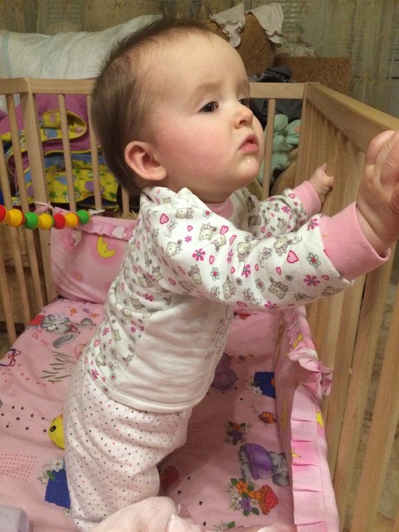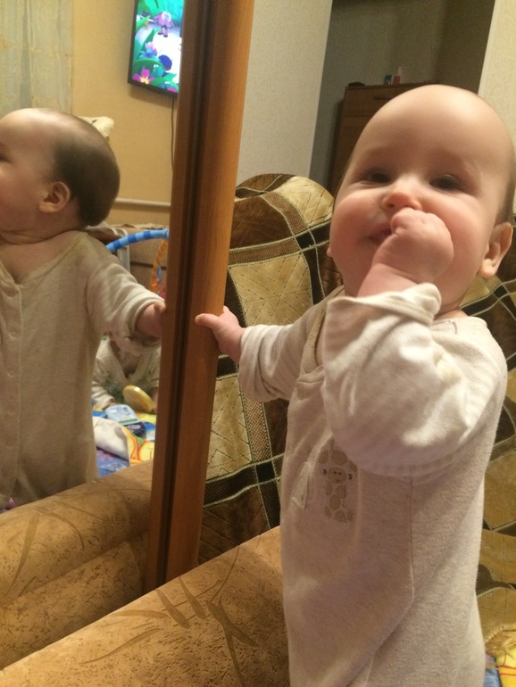 Дети, дети растут. Были утром у врача - Лева 76 и 8800, Сонька 74 и 8500. Умелок добавилось, а с ними и седые волосы. Лева встал у опоры в 7 месяцев, а Соня сначала села из положения лежа в 7 месяцев и неделю. Потом Лева научился плюхаться на попу из положения стоя в 7 месяцев и неделю, а Соня в 7 месяцев и 2 недели встала. Оба бормочут, не заткнуть ничем. Особенно нравиться болтать перед зеркалом, подползут, сядут и рассказывают басни сами себе
