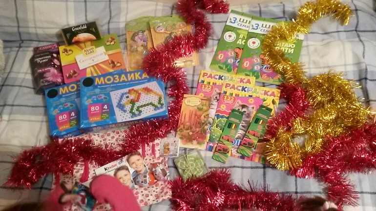 Замечательно! Снегурочка угадала с подарками как нельзя лучше! Только я собиралась мозаику детям купить -пожалуйста! Маки фанат наклеек, а Ирэна рисует карандашами и только ими - вот все, что нужно! Мы уже почти всем начали пользоваться. Открыточки.... Я прослезилась! А мне подарок - супер! Как приятно... От незнакомого человека... Очень сложный период у нас в семье сейчас и как кстати эта затея с подарками. Так здорово!