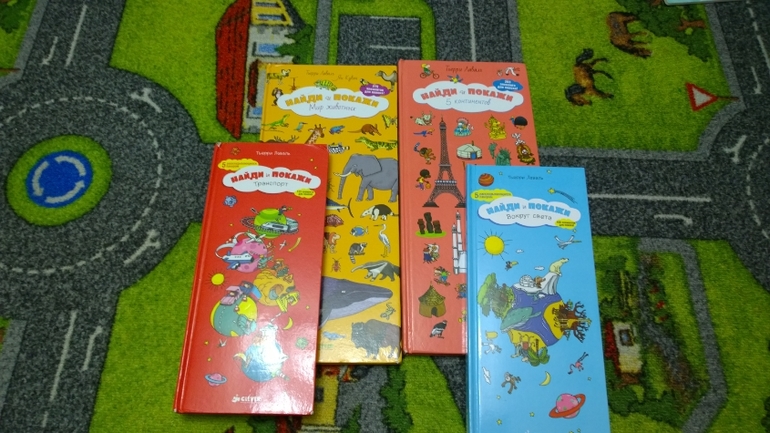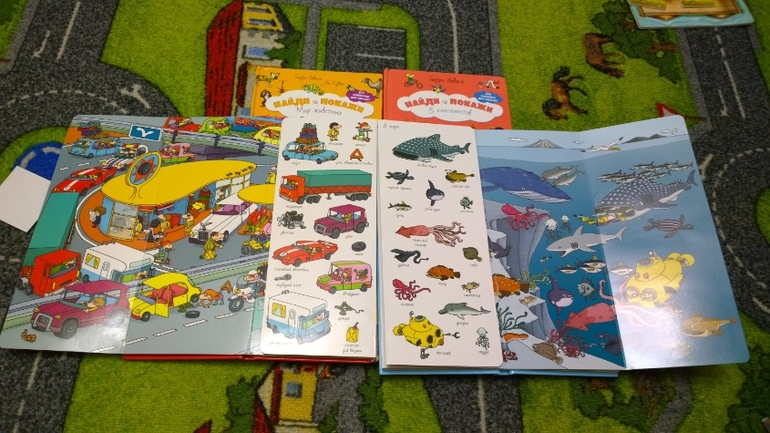 Хочется отметить книжки-гляделки от Клевера. Купили мы их в 2,5 и они сейчас у нас в фаворите :) Принцип такой - выбираете один объект на страничке и ищите его на общей картинке. Мы играем так 1. Каждый сам выбирает, что хочет найти, 2. Мама выбирает детям, что искать. 3. Дети выбирают друг для друга, что будут искать и тут мама уже свободна :) Книги такие: