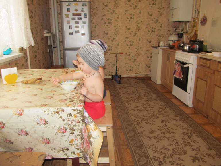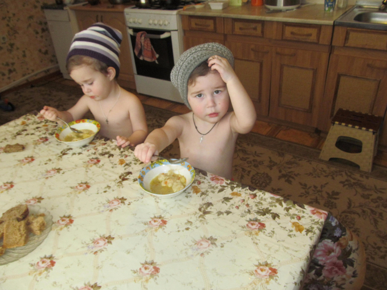 Когда кушают, я им и кофты и футболки снимаю. А то заляпают всё! Без этого никак