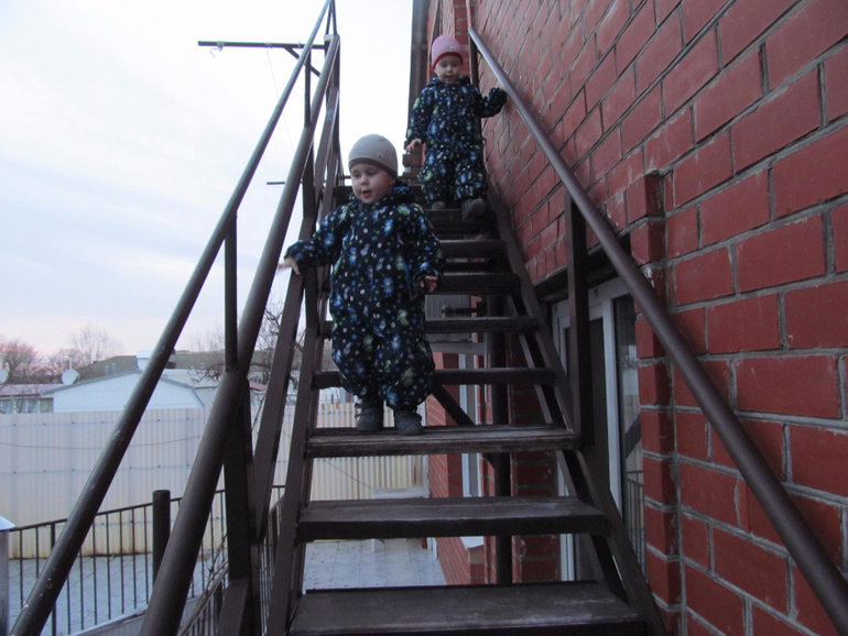 4.Очень любят лазить везде. И дома по мостику (им бабушка смастерила), и по лестнице на третий этаж во дворе, и на площадке на всяких турничках. Ромчик - половчее