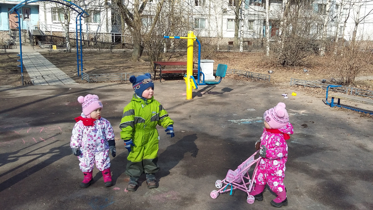 Пинают мяч, на площадке больше всего любят оккупировать песочницу и там копошиться. Других детей не воспринимают, смотрят подозрительно или толкают, независимо от возраста.
