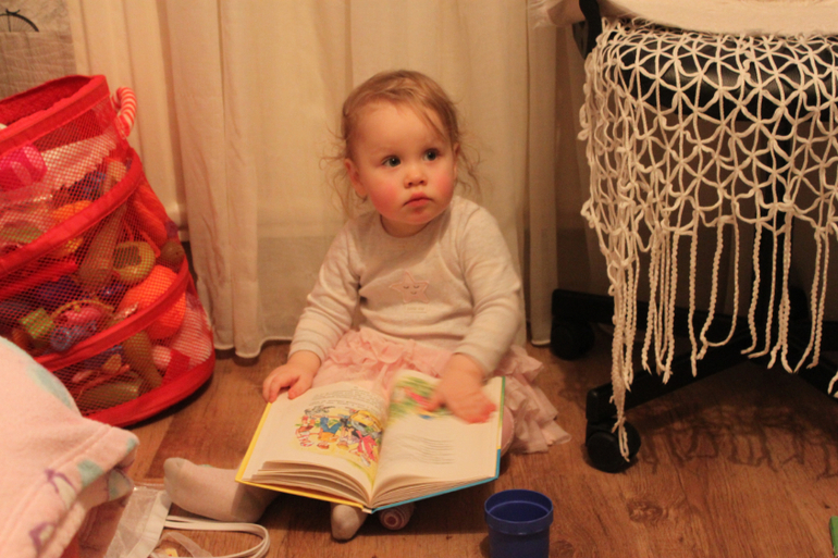 В книжках показывают собачек с кошками, в каталогах (их нам постоянно присылают) туфли и сумочки. Знают все части тела, по просьбе и в хорошем расположении духа топочут, кружатся, целуют. Любят загибать пальцы и у себя, и у взрослых. Говорят: мама, папа, баба, витя, киса, кака, свет, ум, дети, сыр, очень категоричное нет, (н'э), катя (тятя, атя), кар, кря (это на всех птиц почему-то). Знают, как говорит Жюльен или Шаня, как высказываются остальные кошечки, как собачки. Много повторяют, производят сложные и длинные конструкции из разных слогов.