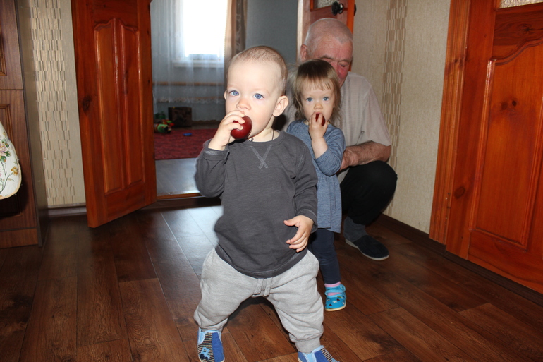 Из умелок: научились правильно подниматься и спускаться по лестницам (горки, стремянки и т.д.); очень любят выкидывать в ведро использованный памперс, многое могут принести по просьбе (Захар это делает всегда и с радостью, а Ульяна по настроению); пытаются есть ложкой самостоятельно (когда у мамы есть желание отмыть кухню); Захар, по просьбе, приводит Ульяну за руку или любого человека, кто в гостях. Если Ульяна не дает руку, то Захар толкает ее в спину и приводит таким способом. Много говорят: кокОко (яйцо, Ульяна очень полюбила и теперь кокОко все, что по форме напоминает яйцо, а цвет не важен, на Пасху она увидела, что кокОки бывают разных оттенков). Кака, ава, бах, бОбо... т.е. уже изъясняются и их можно понять. Ульяна обожает вытирать рот салфеткой во время еды. А еще мы заболели, первый раз - серьезно, острый бронхит у обоих: кашель, насморк и температура. Пьем АБ, небулайзер (они его называют "буль-буль"). Дети ходят с платком и вытирают сопли и сами себе и друг другу.
