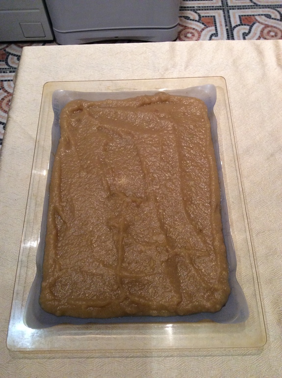 Так, о чем этом я? Ааааа, ну вот собственно и противень с ковриком. Все массу вываливаем и разравниваем. Слой должен быть очень толстым. В идеале около 5 см, но у меня обычно около 2,5 получается.