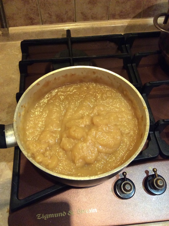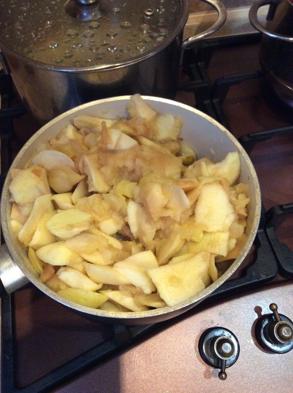 Вот так. На фото видно, что яблоки которым места в сотейнике хватало, теперь занимают только половину его объёма.