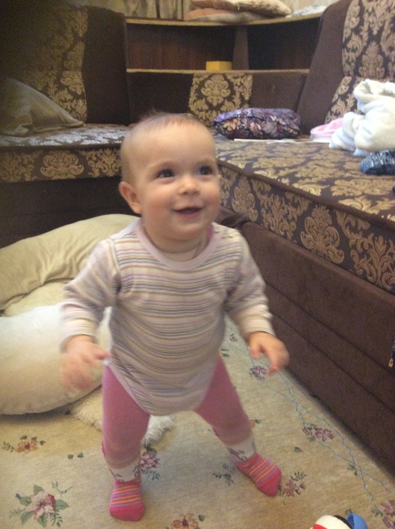 Маринка чуть-чуть (обычно на пару недель) отстаёт от Кирилла. Так было с переворотами, сидением, ползанием, вставанием. Но сейчас эта девушка взяла низкий старт на самостоятельную ходьбу. Она стала стоять самостоятельно недели две назад и при этом стоит 2-3 минуты без поддержки. Особенно если забудется и держит в руках что-то интересное. Передвигается теперь исключительно вертикально, держась за все что подвернётся и довольно уверенно. Четвереньки она освоила, но видно, что ей не нравится так передвигаться. Зато активно лезет вверх и подтягивается на всём, чем можно подтянуться. Оооооочень активно и эмоционально общается и совершенно осознанно "мамкает". Остальные слова-папа, баба есть, но они не персонифицированы пока. Совершенно чумовым образом ругается: дидиди и бррррр. Хохотушка и веселушка, всем улыбается и с удовольствием общается даже с незнакомыми.