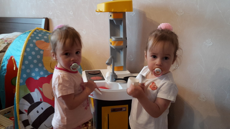 Немного цифр - рост 84-85 см, вес у Ани 9.8 кг, у Кати 10.1 кг, за год прибавили по 2 кг и 12 см. Скоро будут плановые осмотры, пока были педиатр и остеопат, оба довольны. Я думала, врачи придерутся к нашим скромным речевым навыкам, но нет, сказали не волноваться по этому поводу.