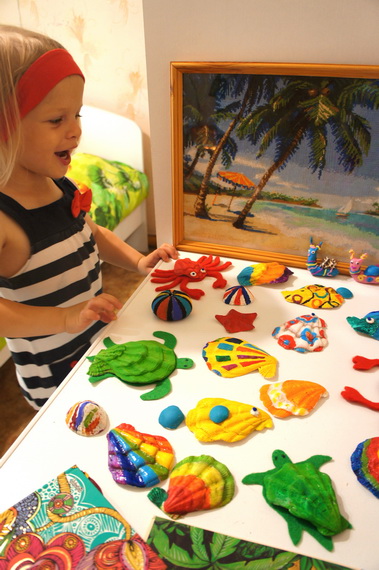 Каждый год мы занимаемся творчеством на морскую тему.Был у нас аквариум с рыбками, нарисованный на 3-литровой банке (фото не сохранилось),похожие идеи видела в пластилиновом исполнении, ставили отпечатки ладошек и ступней,