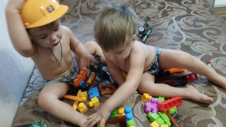Теперь у нас есть "Длель, как у зоседей" (дрель, как у соседей), "молоток, как у Мулле Мека", "уровень, как у папы". Построили домик из конструктора, ремонтируем пилой и молотком)))