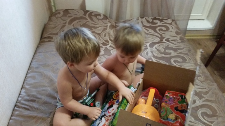 Конфетки пытались открыть, но им было объявлено, что это для папы. Потом папе и преподнесли "подарок".