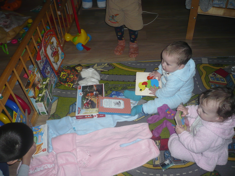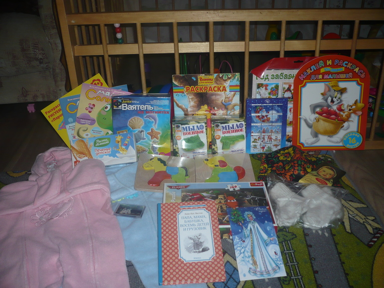 От детей только и слышала:...ооооо...ооооооо.....вауу! Мелкие, пока я фоткала, выли в кроватке, просились скорее в эту гору подарков. Как это так, все смотрят, расставляют, а они в заключении. Милая Настенька из Ангарска отправила нам не только сладости и игрушки, но и комбезы, совершенно очаровательные, милейшие и нежнейшие комбезы!