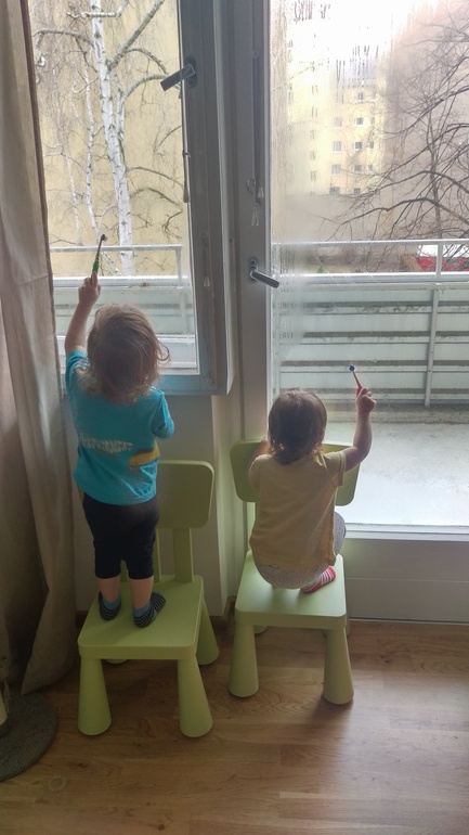 Мои совсем без фантазии - щетками чистят зубы, уже две недели Захар не есть пасту с щетки, а сплевывпет - Ульяна научила. И,да, Захару зубы чищу я или муж, прЫнц, а Ульяна, давно сама чистит.
