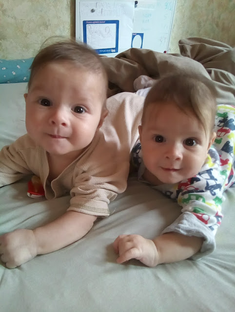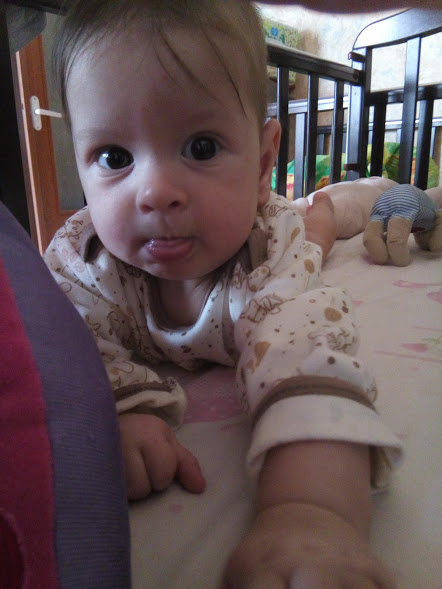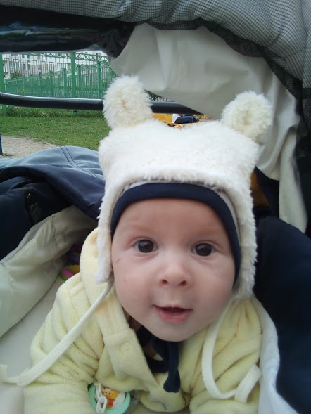 Достижений с прошлого месяца мало. Гриша все активнее переворачивается вправо со спины на живот и учится через лево, пару раз было,каждый день его катаю в слабую сторону. Тоже несколько раз вскочил на прямые руки, перекладывает игрушку из руки в руку, трогает ноги.